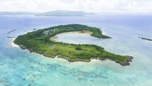 水納島は、沖縄本島から、高速船で15分ほどで着く小さな離島です。人口わずか50人ほどで、その島の形から「クロワッサンアイランド」とも呼ばれています。美しいエメラルドグリーンの海と白い砂浜のコントラストが特徴で、島の周囲わずか4.6kmほど。