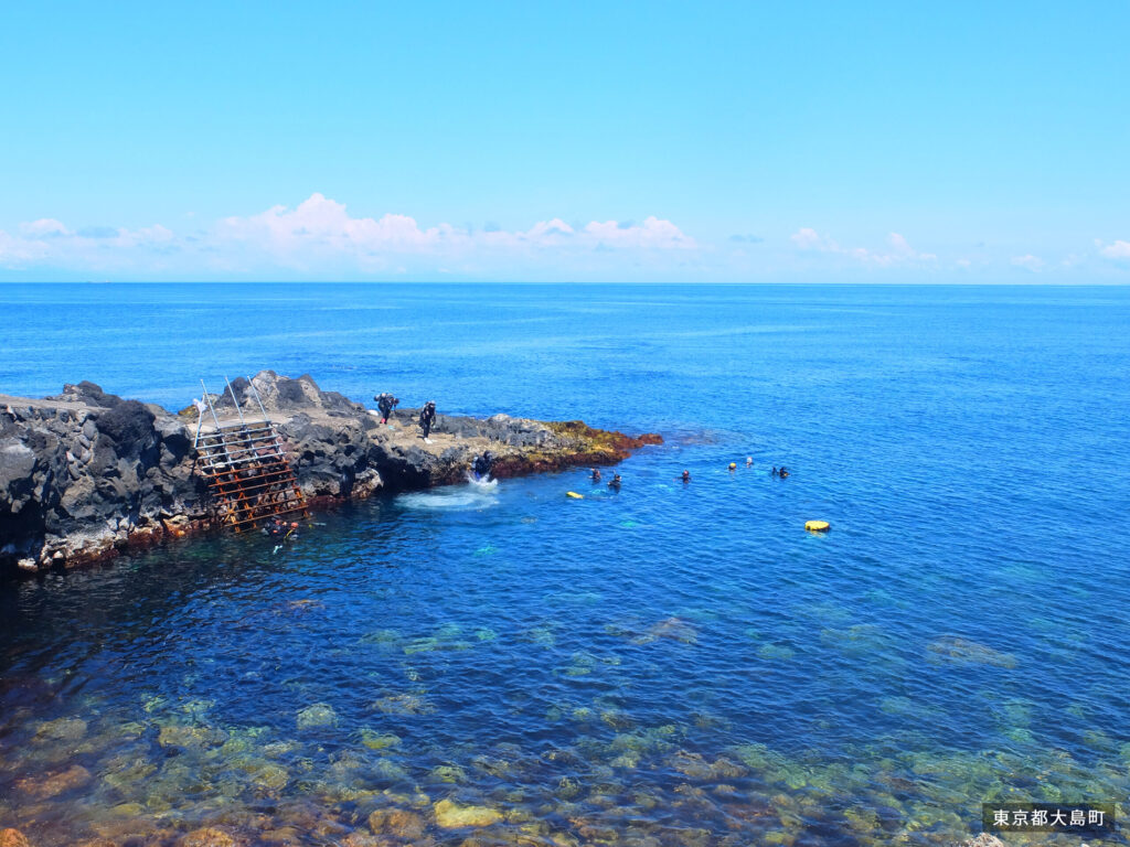 伊豆大島を代表するダイビングポイントで、シュノーケリングにも最適。やや水深はありますが、その分生き物の種類が非常に豊富です。飛び込み台があり、子どもたちに大人気です。ただし、浅い場所がないため、常に浮いていないといけないので、泳ぎが苦手だったり海が少しでも怖い方は要注意です。