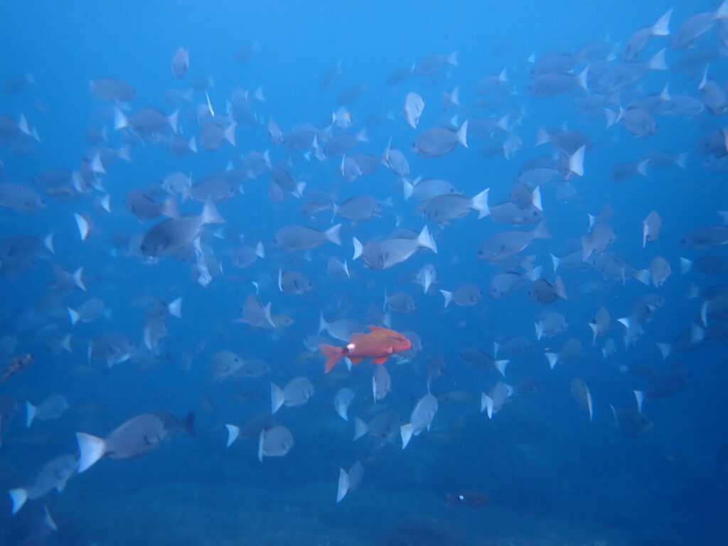 ウツボやタカノハダイの群れ、小型のカンパチなど、伊豆半島で見られる温帯種の魚たちもよく見られます。