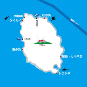 ビーチから手軽にエントリーできるシュノーケリングポイントが多いのも、伊豆大島の大きな魅力です。「秋の浜」「野田浜」「王の浜」「トウシキ」などのポイントがあります。