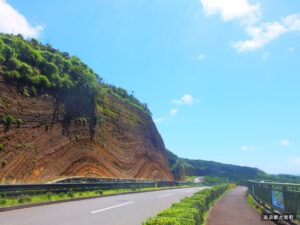「バームクーヘン」とも呼ばれる巨大な地層断面は必見。島の1周道路沿いに、見事な縞模様の地層が600m以上も続いています。これは過去2万年間に繰り返された大噴火、約100回分の噴出物。