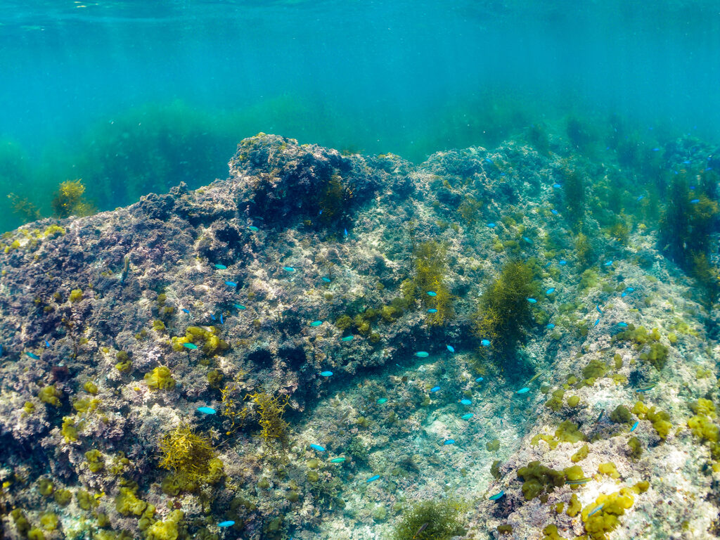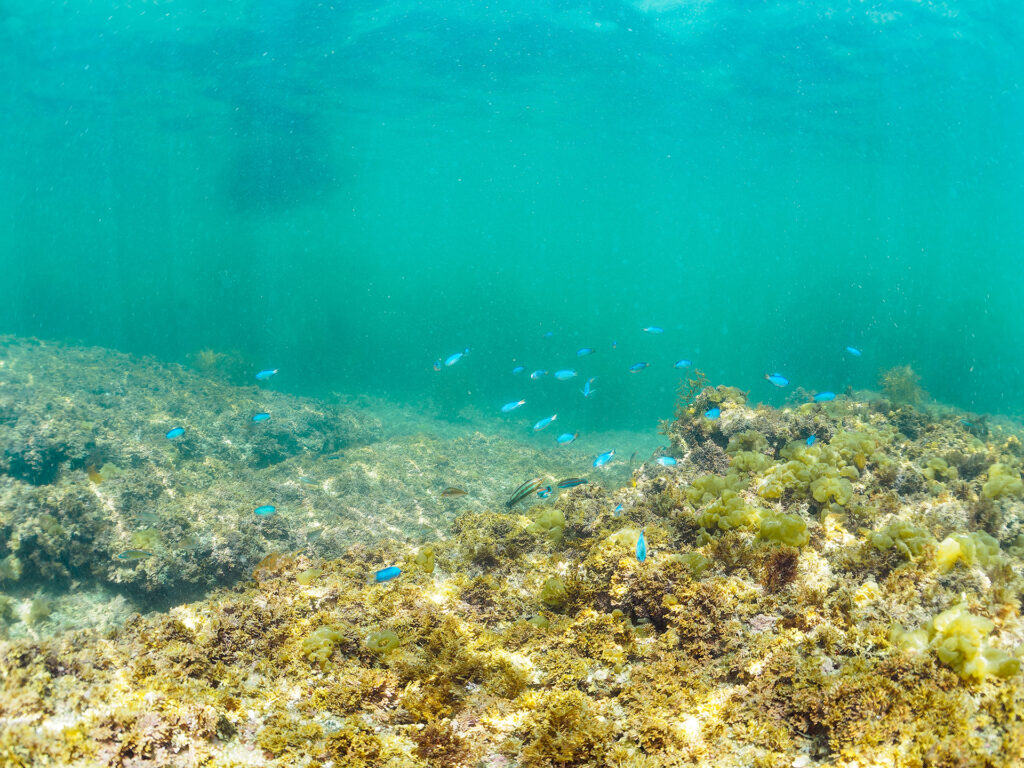 荒井浜はビーチ側の浅瀬では魚は少ないですが、奥側の島のような岩場や桟橋付近に行くと、カラフルな魚たちに出会えます。
