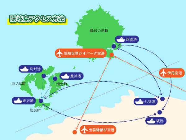 出雲縁結び空港(島根)、伊丹空港(大阪)から隠岐世界ジオパーク空港(隠岐の島町)まで直行便が運行しています。