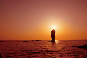 ローソク島は約500万年前にできた火山岩。高さ約20mの巨大な岩峰を遊覧船に乗って海から見ることができます。岩の頂点に夕日が落ち、まるでローソクに灯がついたかのような神秘的な瞬間は感動的です。