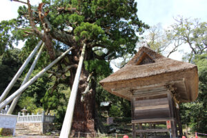 樹高38m、周囲20m前後ある大木「八百杉」。樹齢約2000年といわれており、隠岐島の三大杉の中で最高樹齢を誇ります。杉を支える多くの添木が、古くから島民達とともに生きてきたことを物語っているようです。1929年に国の天然記念物に指定されています。