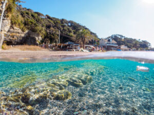 手前は魚が少ないですが、桟橋の先端の下や、奥に見える小さな島の近くまで泳いでいくとお魚がたくさんいます◎ 荒井浜海水浴場は、海水浴:2/3 シュノーケリング:1/3と、意外とシュノーケラーも多いスポット!マスク・シュノーケル・フィンの3点セットを忘れずに持って行こう♪